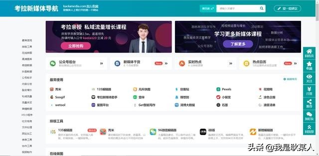考拉新媒体运营是一个整合类的网站,做新媒体的朋友可以关注一下,这个网站罗列了从排版工具到视频制作等等,罗列的很清楚,不需要频繁的找网站了,有这个就够了