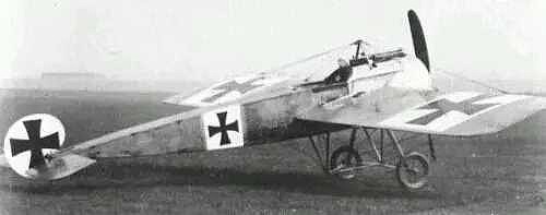 1915年夏天,德军的第一种真正的单座战斗机福克(Fokker)E型单翼机出现了,由荷兰设计师福克设计的这款新机在引擎罩上装有一挺机枪,通过机枪射击同步协调器令子弹穿过螺旋桨叶片向前射击。