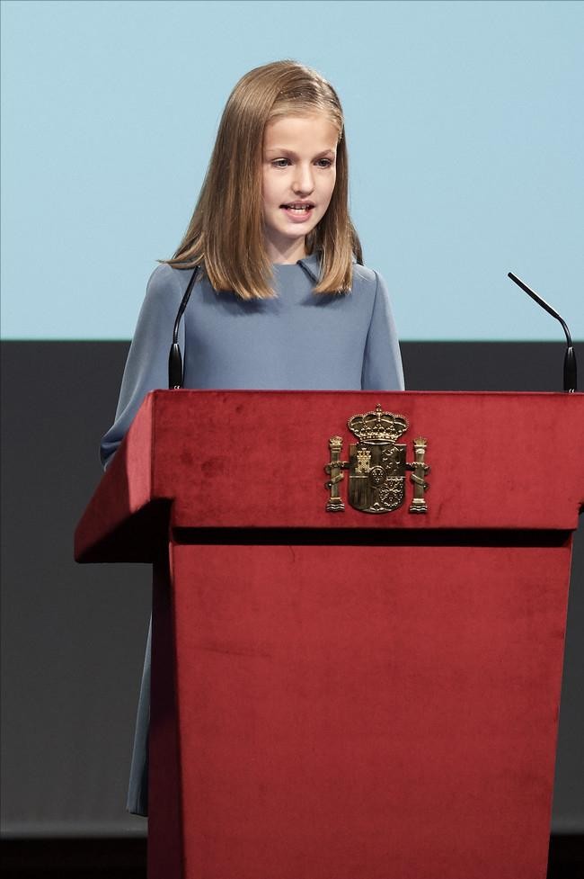 2018年10月31日,在西班牙马德里举办的40周年宣读会上,13岁的莱昂诺尔公主独自在台上演讲,才13岁的孩子就能独当一面了。