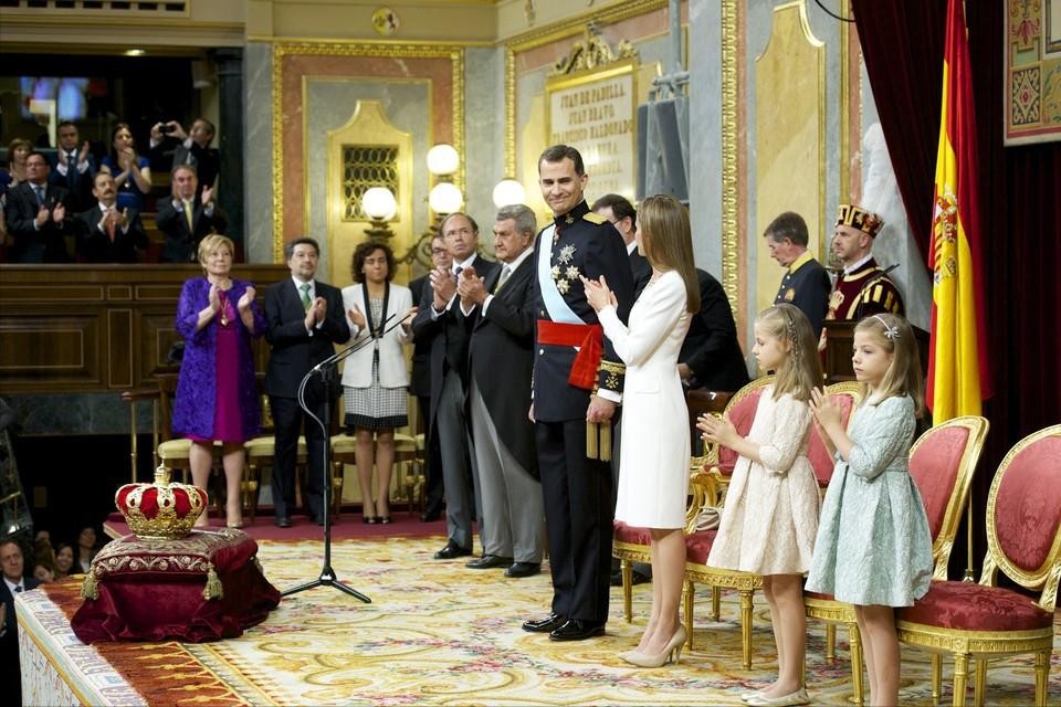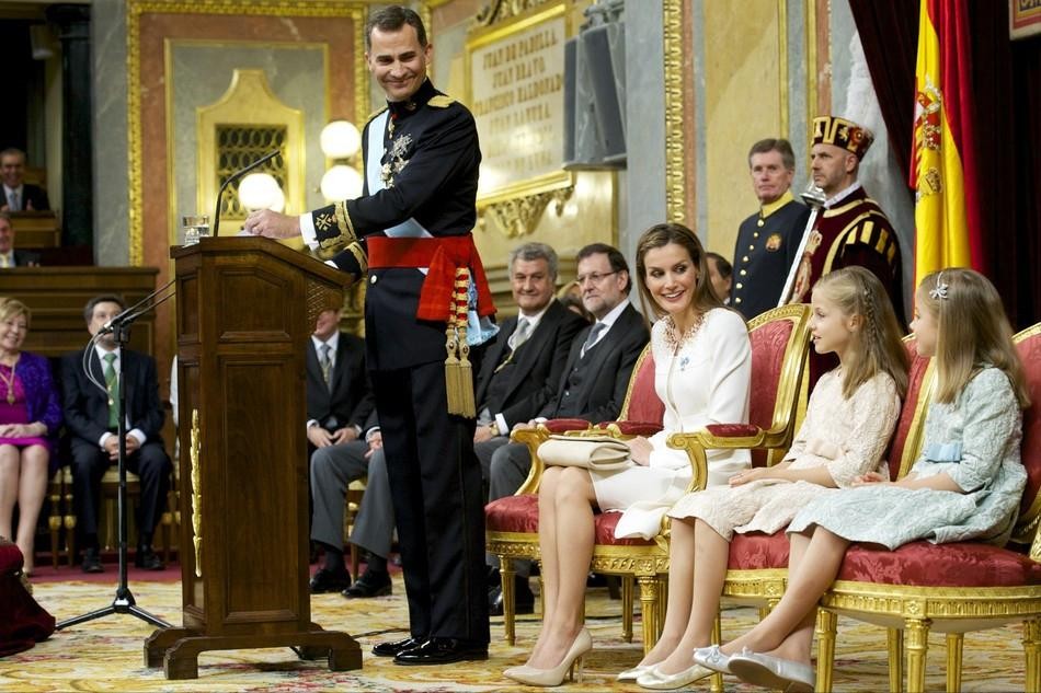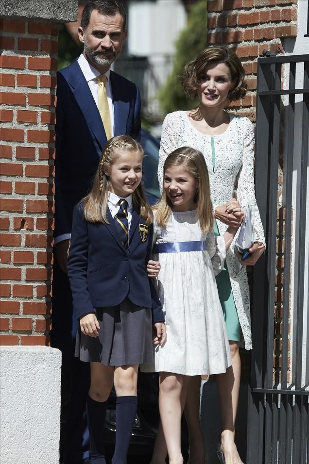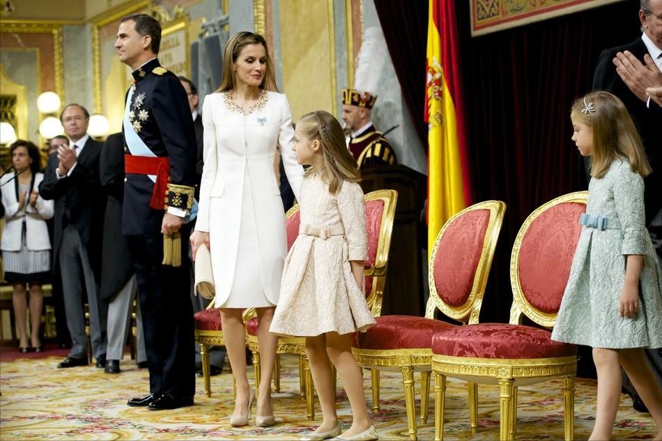 2014年6月19日,在西班牙马德里举行的典礼上,他们一家四口亮相,莱蒂齐亚王后气质真优雅,身穿一款白色的连衣裙彰显着王后的端庄与大雅。