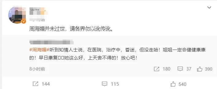 周海媚这边,12月11日晚,网络上开始流传她去世的消息。