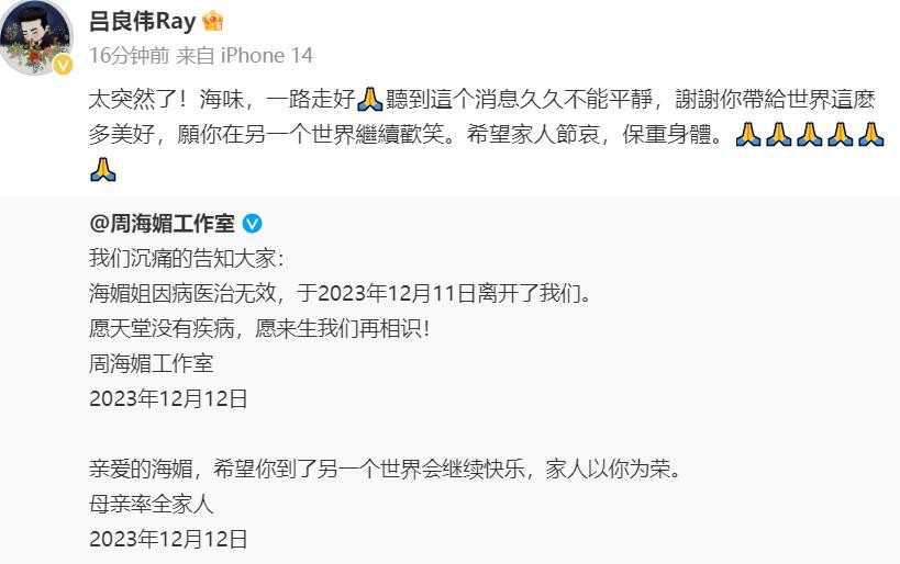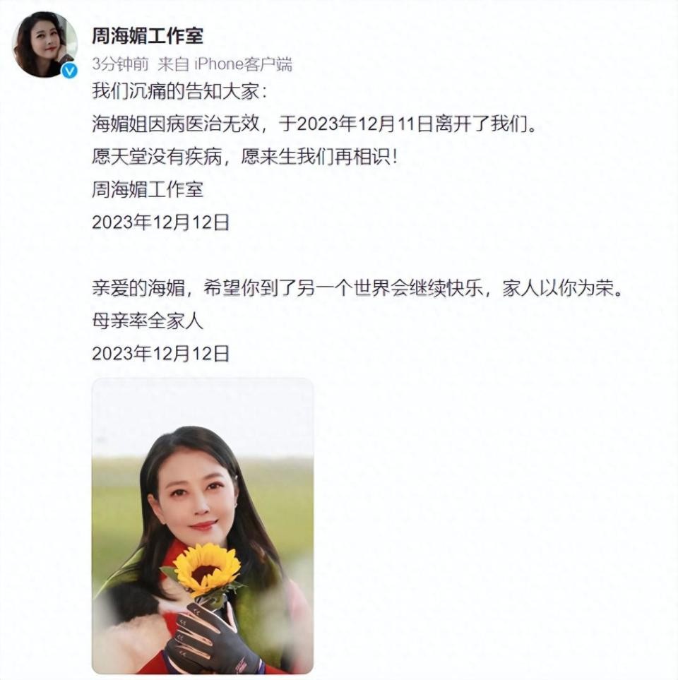 但仅仅一天之后,周海媚工作室就发出声明,确认她已于11日离世。