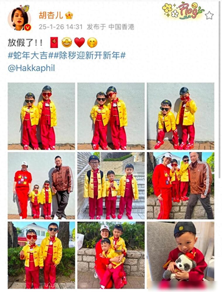 胡杏儿的三个儿子在照片中身穿同款新年唐装,帅气可爱,兄弟情深。这种穿着不仅展现了浓厚的春节气氛,也体现了家庭成员间的深厚感情和认同感。每个孩子在镜头前的表现都显得自然又酷炫,令人羡慕不已。