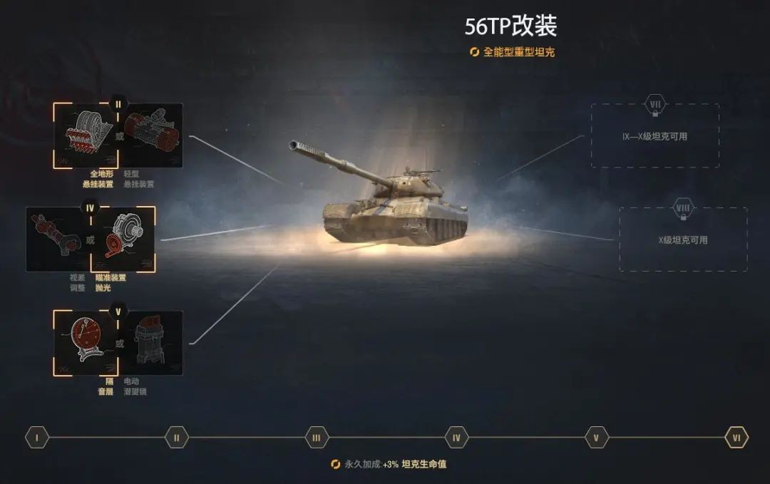 战地升级对提升56TP的战斗力也非常重要,该车在战地改装达到VI级后,可以获得额外的3%坦克生命值加成,同时可以选择3项性能升级与1项配件加成栏位选择。3项性能改装玩家可以选择“全地形悬挂装置”、“瞄准装置抛光”与“隔音层”以加强坦克战斗力。配件加成栏位选择可以为第二个配件栏位选择“火力”或者“机动”,具体选择取决于玩家。玩家可以选择输弹机/改进型通风系统/改进耐久/结构调整/火炮垂直稳定器/高级光学观察镜等配件以提升56TP的作战效率。56TP有如下优缺点:
