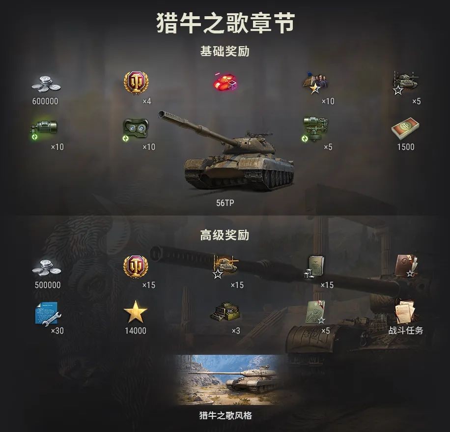 “猎牛之歌”风格的灵感源于16世纪初的经典文学作品:一首描写野牛的雄姿和野性、追猎场景的诗歌。如果您获得了56TP专属风格“猎牛之歌”,它将在章节开放后的110天内为您解锁简单的每日任务,只需驾驶56TP取得1场战斗胜利即可完成该任务,并获得丰厚的随机每日奖励。