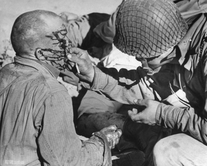 医护兵正在清理一名伤兵脸上的血迹和油污。就在不久前这里刚刚被九架Me-109战斗机扫射,这名受伤的半履带车机枪手艰难地吞咽下了磺胺类药片,随后赶来的军医递给他水帮助他吞服药物,而其它车上的人已经被打死。