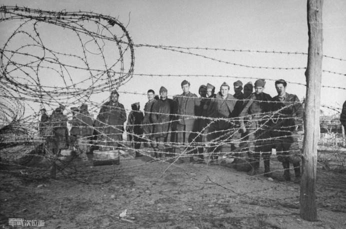 带刺的铁丝网围墙关押着在塞涅德俘虏的轴心国战俘