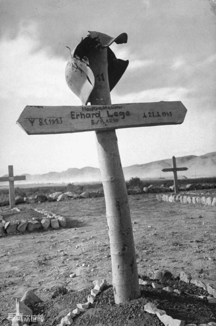 德军阵亡将士墓地,上面有一顶残破的钢盔