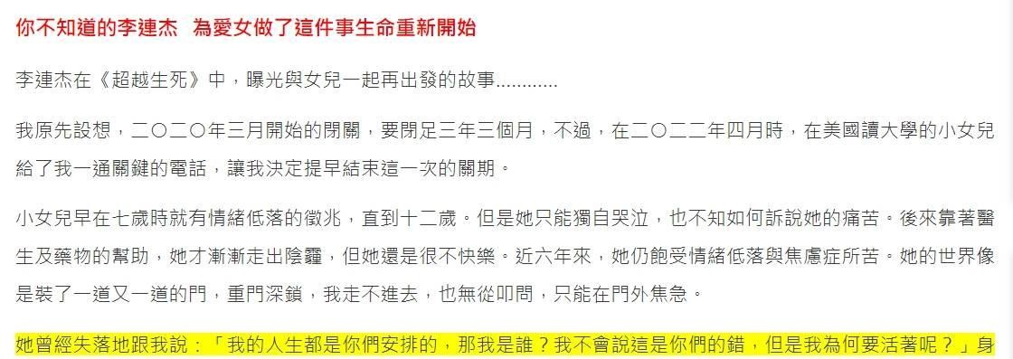 近日,有消息称功夫演员李连杰去世,但当天他出现在公开活动上,精神状态很好。然而,几年前,李家的小女儿Jada在社交媒体上公开患有严重抑郁症,引起了网友的热议。据透露,Jada从小学习成绩优异,但抑郁症的出现让她感受到压力,从而导致情绪低落。