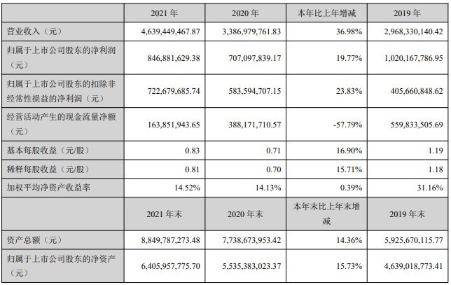 年报显示,2021年朗新科技营业收入为46.39亿元,同比增长36.98%;归属于上市公司股东的净利润为8.47亿元,同比增长19.77%;扣非后的净利润为7.53亿元,增23.83%。净利润的增幅落后营业收入增幅逾10个百分点。