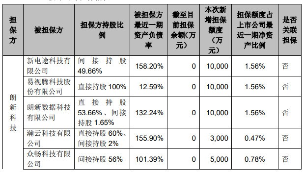 3月25日,朗新科技披露《关于为子公司提供担保额度预计的公告》,称公司预计在2022年度为四家控股子公司新电途科技有限公司、朗新数据科技有限公司、瀚云科技有限公司、众畅科技有限公司提供最高不超过2.8亿元的担保额度。这四家子公司最近一期资产负债率分别为158.20%、132.24%、155.90%、101.39%。