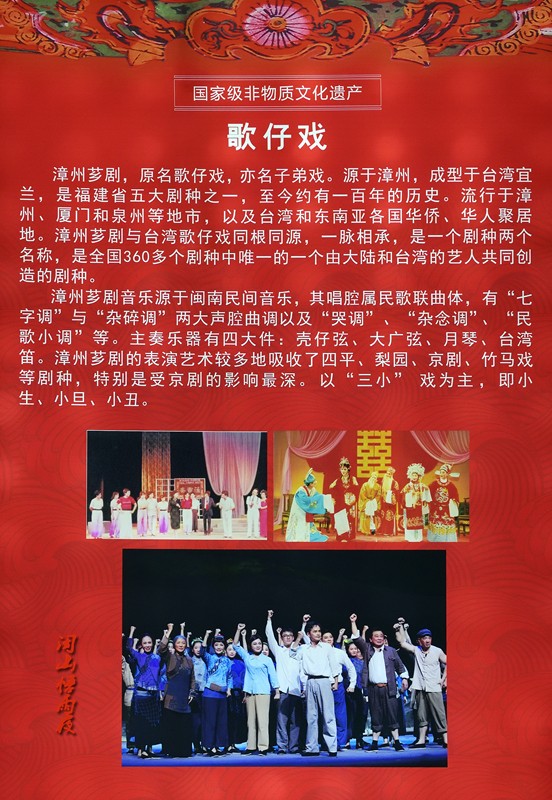 “歌仔戏”(国家级),起源漳州,却于台湾宜兰成形,盛行闽南厦、漳、泉及台湾。