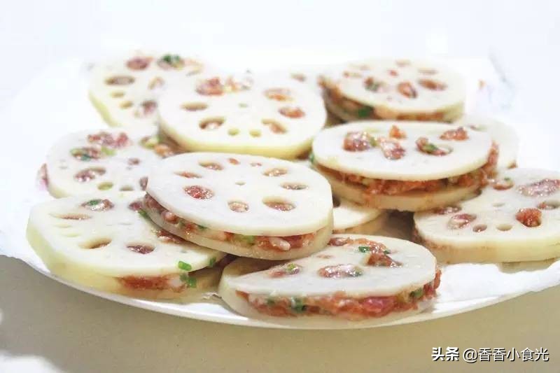 香炸藕盒,味道鲜美、色泽金黄、外酥里嫩,咬一口在嘴中,肉汁四溢,是一道非常地道美味的家常菜。做法也不难,两片莲藕中夹上肉馅,放入油锅中炸熟即可。