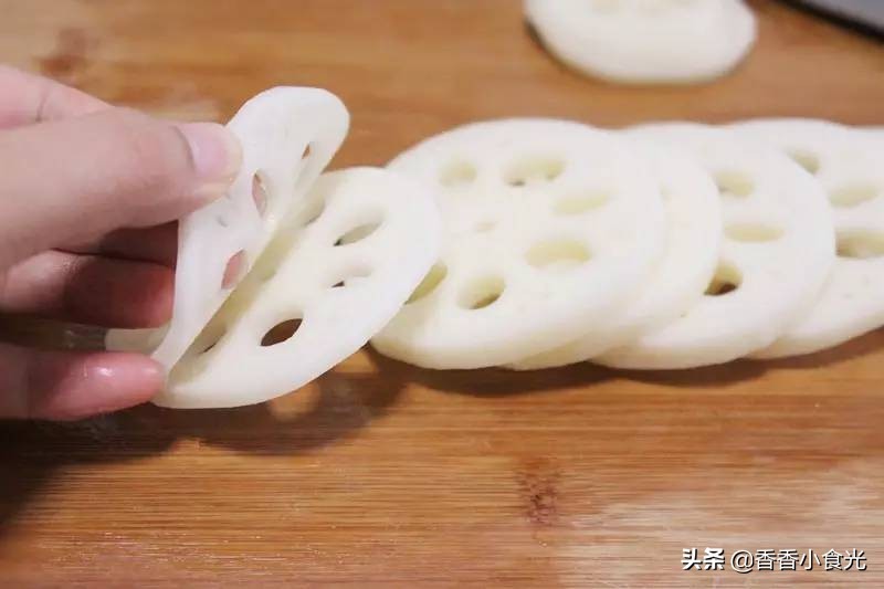 1、将莲藕去皮,切成3到4毫升厚的片,每两片中间不要切段。