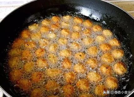 9、油热六七成时开始下丸子:左手虎口挤出一个小圆球,右手把小圆球放到锅里,这样重复做,直到把面糊做完,中小火慢炸,炸至金黄色丸子浮起来就可以了,捞出控油。外焦里嫩的丸子做好了。