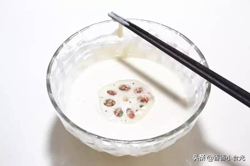 8、将藕夹放入面糊中,使表面匀均的裹上一层面糊。