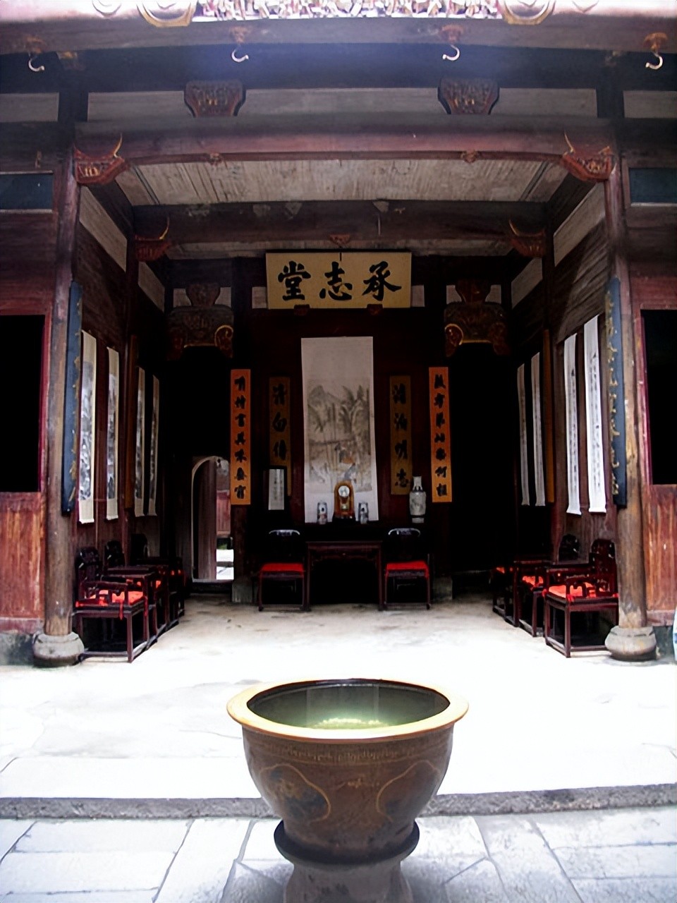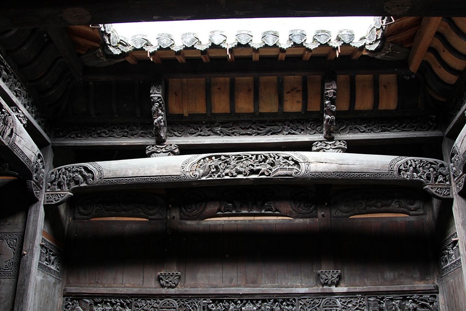 承志堂建于清咸丰五年(1855年),是清末大盐商汪定贵的住宅。整栋建筑为木结构,内部砖、石、木雕装饰富丽堂皇,总占地面积约2100平方米,建筑面积3000余平方米,是一幢保存完整的大型民居建筑。全宅有9个天井,大小房间60间,136根木柱,大小门窗60个。全屋分内院、外院、前堂、后堂、东厢、西厢、书房厅、鱼塘厅、厨房、马厩等。承志堂最令人叹为观止的是它的支柱、额坊、拱棚、门窗等无处不附以精美绝伦的雕饰,既富丽堂皇,又气势非凡。承志堂正厅横梁、斗拱、花门、窗棂上的木刻,工艺精湛、层次繁复、人物众多,堪称徽派“三雕”艺术中的木雕精品。