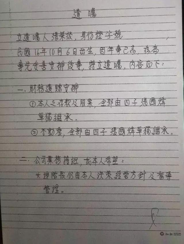2016年张荣发去世,他的手写遗嘱也随之曝光,在遗嘱中,他将长荣集团总裁的位置交给了张国炜,还包括124港元的财务,剩下的才是他的几个哥哥的。