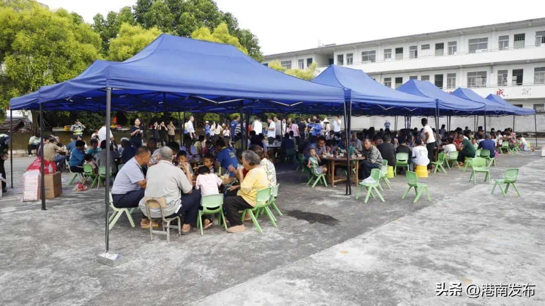 9月13日早上,安置点的大操场上十余顶蓝色的帐篷分三联铺开,安置群众围桌而坐吃起了早餐。“我刚从大村搬到安置点,工作人员安置得很好,有吃又有住,住得好舒服。多谢政府关照我们!” 瓦塘镇大村村民凌春爱说。