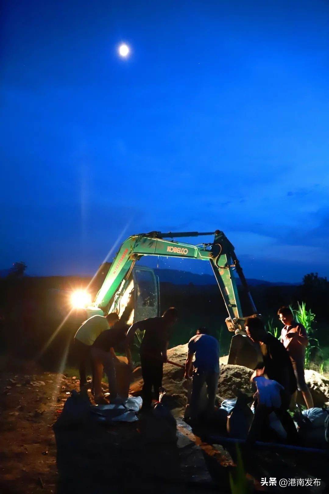 无论白天或黑夜,京屋堤坝下,运输车辆来来往往运输泥沙、木头和石头,救援队员忙着铲沙、装袋、打包、装车,通过小型的拖拉机一车车运送到堤坝上。堤坝上的救援队员排好队伍,一个接一个,将沙包投入加固点,筑牢防洪线。
