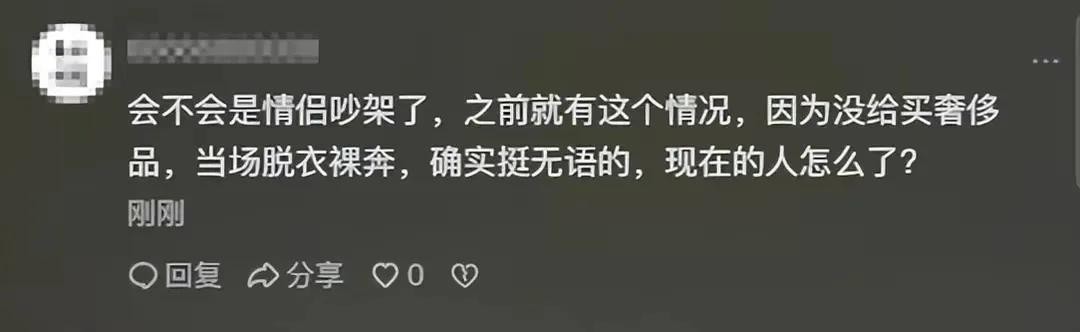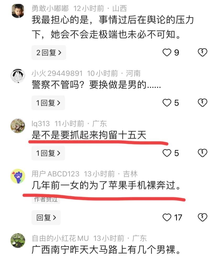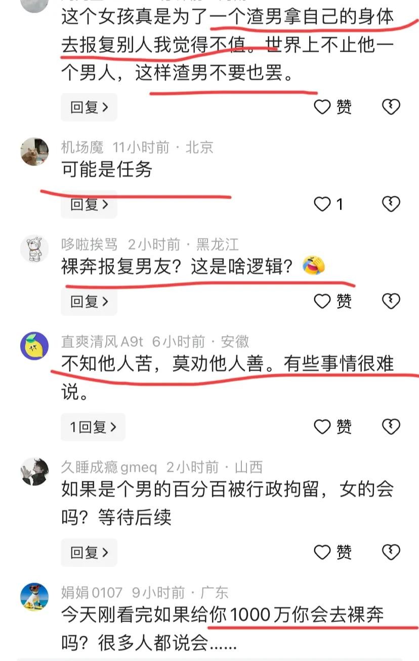 有人猜测,女子是不惜代价,一心想当网红,想出名。有人说,也有可能是打赌打输了,被逼着裸奔。或者有可能是和朋友玩真心话、大冒险。