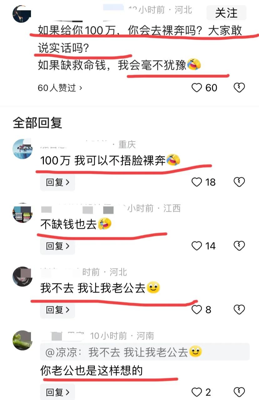 更有网友说:“如果给你100万,你会去裸奔吗?大家敢说实话吗?”
