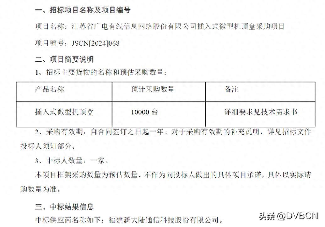 11月19日,由江苏省有线信息网络股份有限公司负责的插入式微型机顶盒采购项目正式开标。