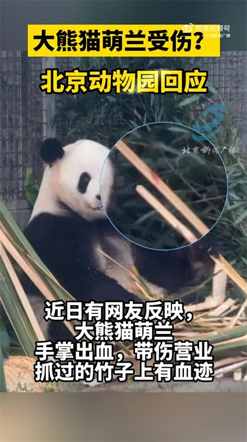 北京动物园微博回应称:10月25日早上饲养员观察发现萌兰兽舍内栖架有少量血迹,饲养员立即上报并通知兽医。为排查造成流血原因,饲养员在确认动物状态平稳后,将萌兰串入运动场取食竹竿、竹叶。经排查未发现可造成破损的异物,初步判定为竹竿划伤导致萌兰左前掌第二指处流血。兽医到场后对伤口进行了检查消毒,并涂抹药剂。目前萌兰正常取食,行走姿态正常,饲养人员将会持续关注动物状态。
