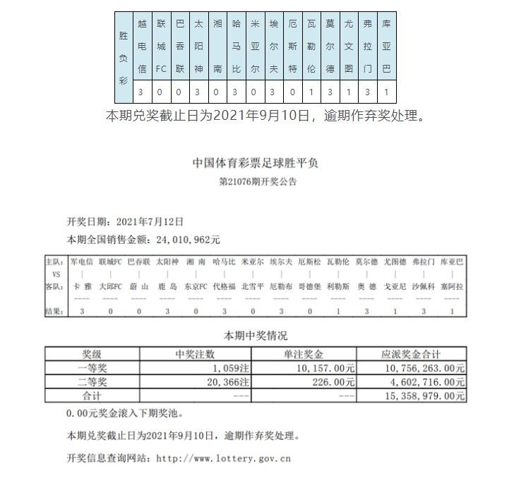 北京时间7月12日,胜负彩第21076期开奖结果揭晓。本期14场头奖1059注10157元,二等20366注226元;任九头奖开出58749注129元。本期足彩14场投注总额为24,010,962元,任九投注总额为11,849,810元。