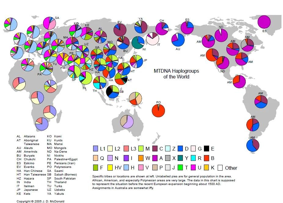 备注:(由于年代久远,加之技术限制,导致传统的基因图谱产生了一些错误,比如乌兹别克人,乌兹别克斯坦共有100多个民族,由于当初研究者忽视了多民族的问题,从而将乌兹别克族、塔塔尔族、俄罗斯族、犹太族等全部笼统归入乌兹别克人,因此导致了错误的出现。)