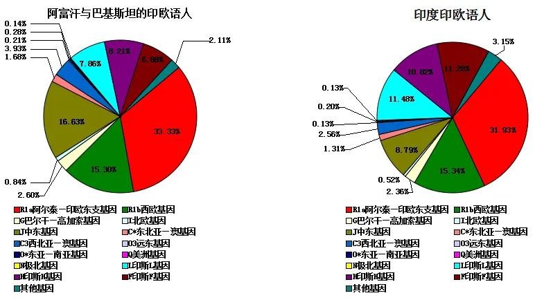 阿富汗、巴基斯坦、印度操印欧语民族中雅利安基因占30%—40%。