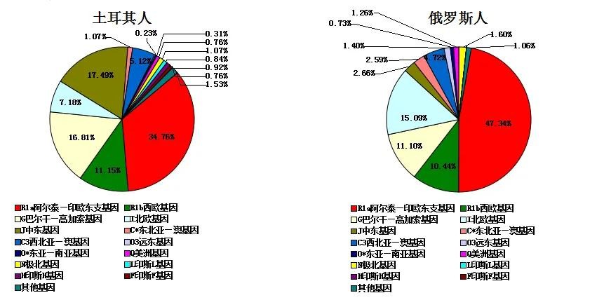 土耳其人也携带相当数量的阿尔泰基因,应该是他们居住于中亚时带过来的。而极北基因可能是居住在西伯利亚的原始部落带来的。