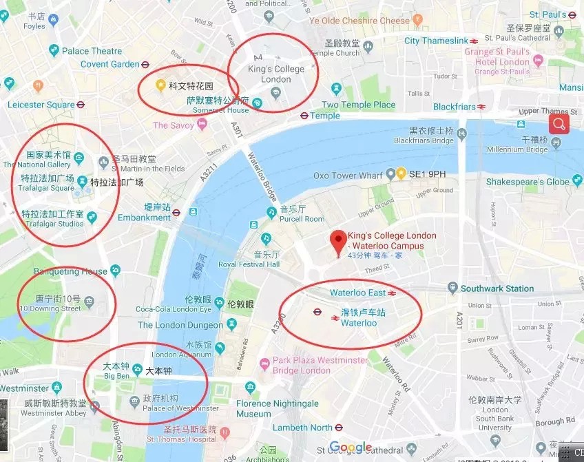 伦敦国王学院共有五个校区,其中四个紧邻泰晤士河的南北两岸: