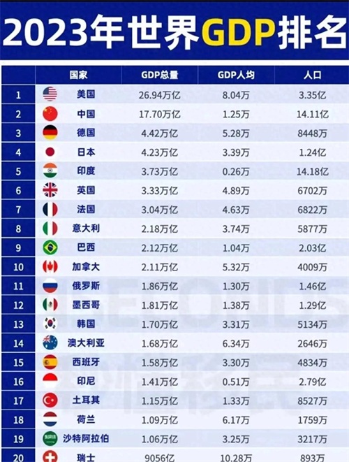 2023年全球主要经济体GDP排行揭晓:美国领跑,中国紧追其后