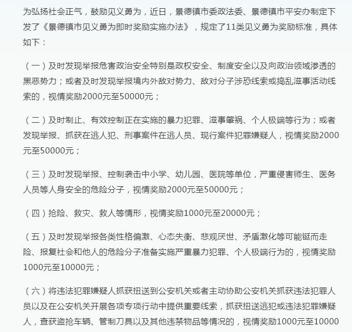 根据各省市公布的“见义勇为奖励办法”来看,不同地区的奖励金额是不一样的,这主要和当地经济有关。近期,江西景德镇公布了见义勇为即时奖励办法,针对抢险、救灾、救人等情形,视情奖励1000元至20000元。而根据2022年苏州公布的“见义勇为称号评定”通知内容了解到,获得市“见义勇为模范”称号的个人,奖励人民币4万元。