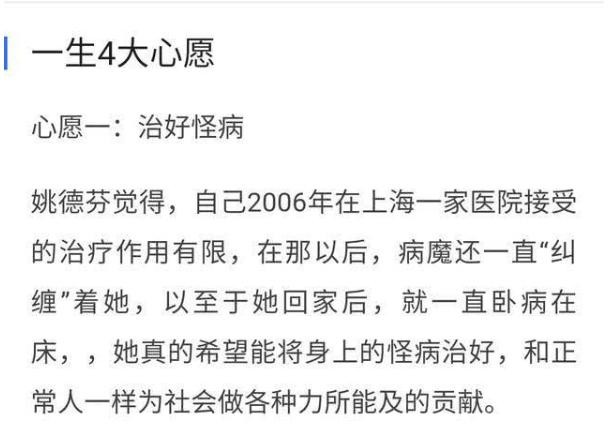 短短41年的人生时光,她几乎有一多半是在病床上度过的,至死她都希望能治好自己的怪病,像一个正常人生活