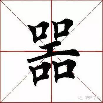 下部两个“口” 左低右高,稍抗肩。左“口”直对上面小“口”,略大于右上角的“口”,稍右斜,左竖稍轻,右竖稍重;右“口”直对上面小“口”,又要大于左“口”,平稳厚重,两个横折都为实接起笔,而右边的最实,注意最后一笔横画的收笔要稍下垂,以稳住整字。