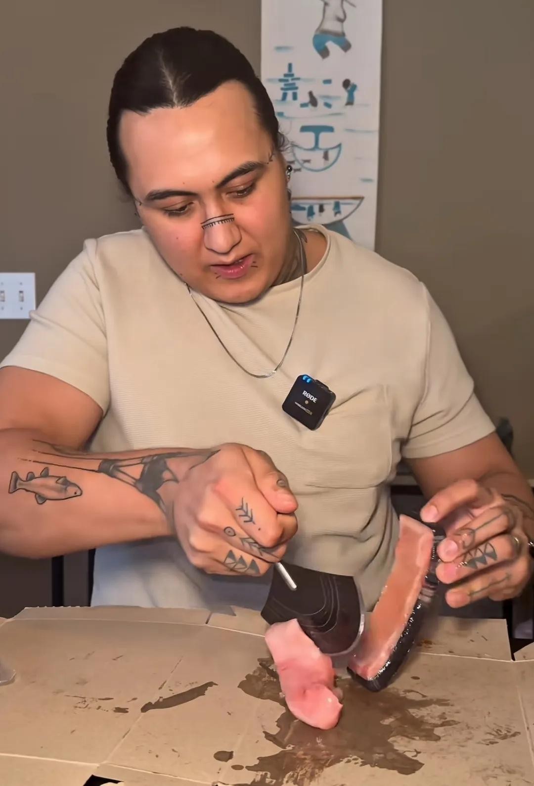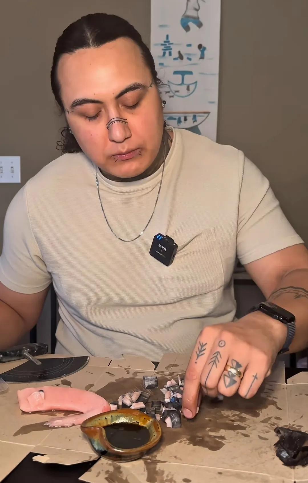 然后沾着佐料嚼着吃,很有嚼劲,类似于吃牛皮的感觉,但是这是因纽特人的传统,当然有些因纽特人会沾鲸血食用。