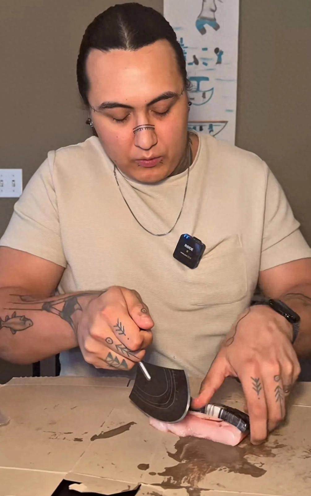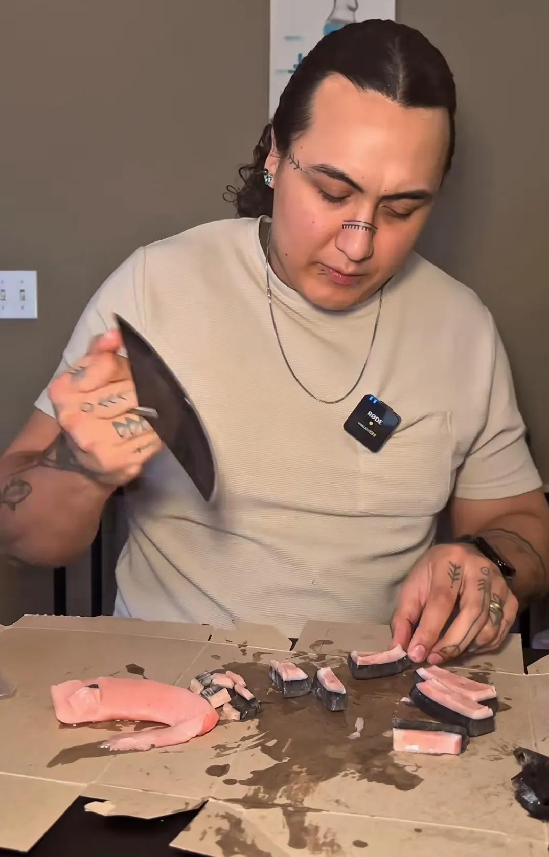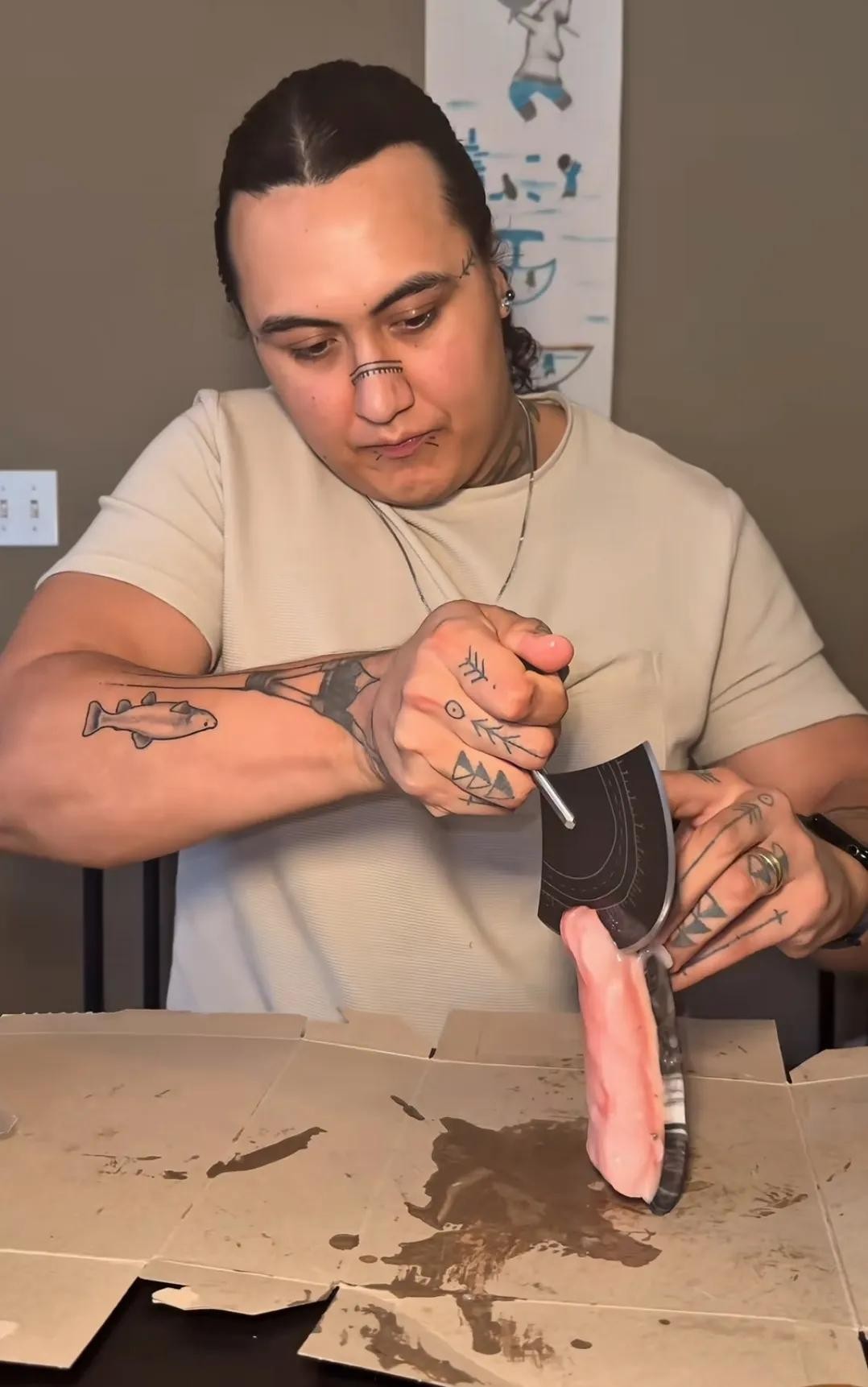 因纽特人取出来一块带皮的鲸鱼肉,这种鲸鱼肉外皮坚硬,只能用祖传的大刀进行切割,