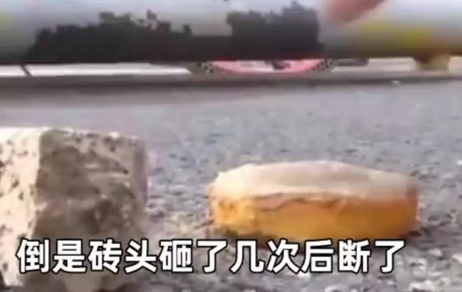 据男子介绍,他在当地的一家超市购买了一些散装蛋糕,吃的时候发现蛋糕坚硬无比,险些把牙给磕掉。随后男子用砖头朝着蛋糕拍下去,本来以为酥软的蛋糕会被拍散,没想到蛋糕被拍后几乎没有变形,倒是砖头砸了几次后断了。