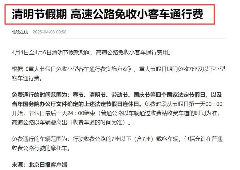 2025清明节高速免费时间来啦!4月3日上高速4号下高速免费吗?