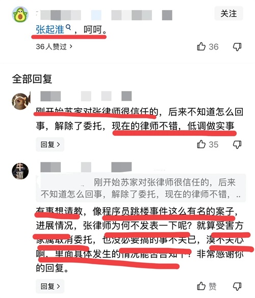 网友:有事想请教,像程序员跳楼事件这么有名的案子,进展情况,张律师为何不发表一下呢?就算受害方家属取消委托也没必要搞得事不关己,漠不关心啊,里面具体发生的情况能否告知?