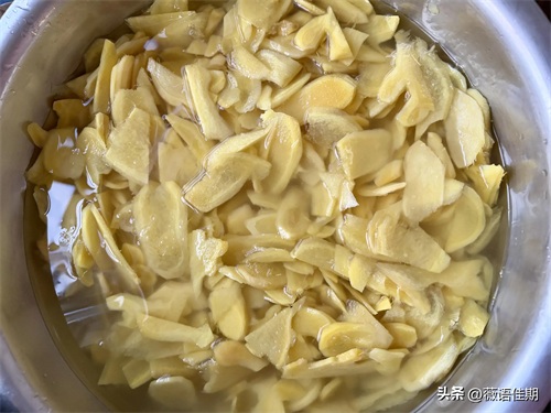 3. 盐糖腌制:姜片用盐搅拌腌制半天时间,之后用清水将盐冲洗干净,多冲洗几次去掉点姜的辛辣,再用白糖拌均腌制一晚上。姜与糖的比例推荐1:1,糖多可遮点辣,作为天然防腐剂的盐和糖腌制保存时间自然持久。