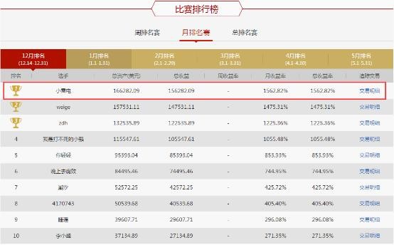 截止今日,模拟交易大赛已进入第五周的赛程,第一个月度冠军已经新鲜出炉,小雷电以1562.82%的收益率博得了第一名,你是想成为下一个冠军吗?