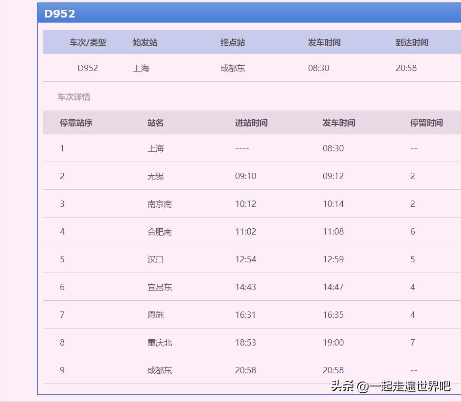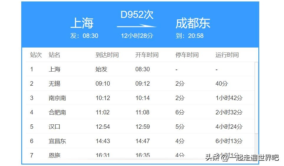 因为我对比了一下上海到成都之间的所有高铁,发现,D952次旅客列车,是设置站点最少的列车,全程只有9站。