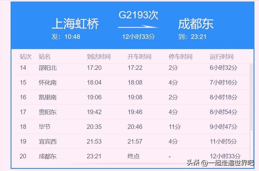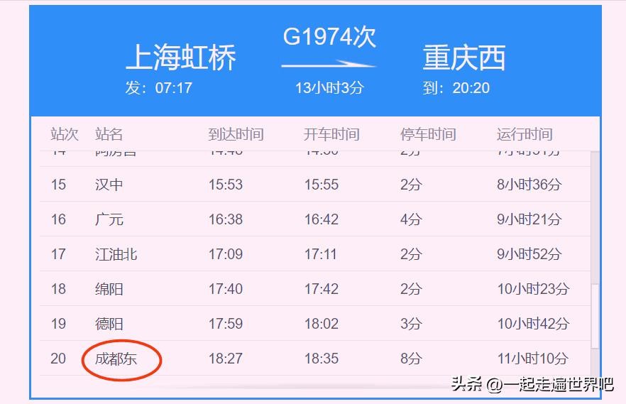 上图为G1974次列车的部分信息,这趟列车,从上海虹桥站发车,终到重庆西站,中途经过成都东站,速度很快,但是,站点也不少。
