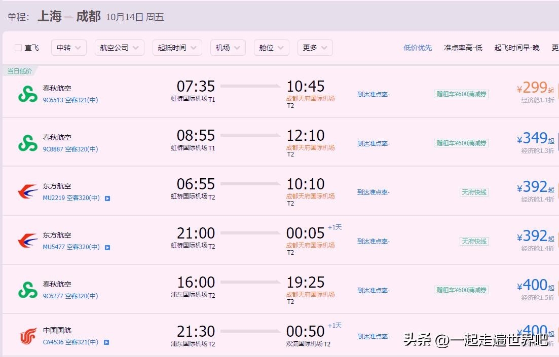 请看上图,上图为上海到成都之间的部分机票信息。