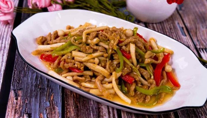 海鲜菇炒肉是一道由海鲜菇、肉、葱姜蒜等材料制成的菜肴。