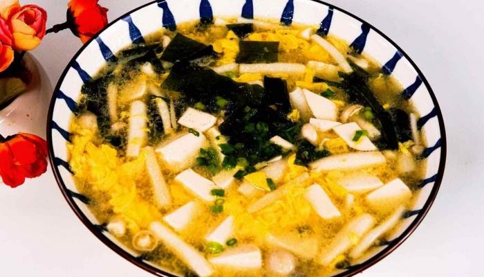 1、食材:豆腐500g、海鲜菇200g、鸡蛋2个、裙带菜200g、小葱2根、姜1块 调味料:盐2g、鸡精2g、淀粉10g、香油5g、胡椒粉2g