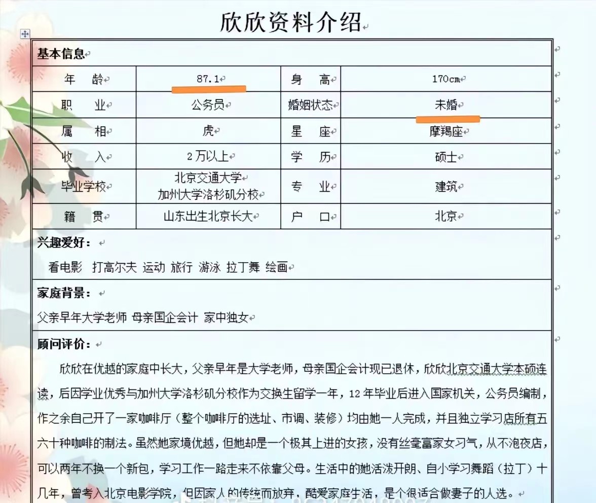 据婚恋网站上显示的信息,翟欣欣1987年1月出生于山东一个高级知识分子家庭,后来在北京长大,外形条件优秀,身高170cm,本硕连读,月收入2万,北京公务员编制,业余还开了一家属于自己的咖啡厅。